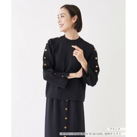 ボタンを開けてアレンジも楽しめるスリーブデザインに心惹かれるニットプルオーバー。きらりと輝くボタンがノーブルで華やかなムードに。浅めのクルーネックに仕上げた上品さのあるアイテムは、同デザインのスカートとセットアップで着こなせば洗練された大人ムードな着こなしに。やや短めの丈感なので、フレアスカートやワイドパンツなど適度にボリュームのあるボトムスと合わせるとバランス良くまとまります。身頃の肩部分は飾りボタン、袖山部分は全て開閉が可能です。