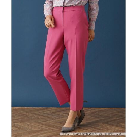 センタープレス入りのすっきりとしたテーパードシルエットが美脚スタイルをメイクしてくれるカラーパンツ。生地にはストレッチを効かせているから、優しいフィット感があり動きやすさも抜群。ウエストにも程よい伸縮性をもたせ、快適なはき心地を叶えました。幅広いコーディネートにマッチし、通勤にも休日カジュアルにも活躍する一本です。スナップボタン&ホック、ファスナーにより着脱が可能。