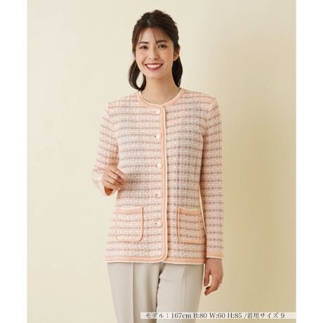 ミックス感溢れるツィーディーな風合いのノーカラーニットジャケット。すっきりとしたシルエットで着こなしやすく、ボトムスを選ばずにコーディネートしやすい一枚。光沢のあるフロントボタンや前ウエストに配されたスモールポケットが大人の可愛らしさを感じさせるディテール。定番のパンツでまとめるのはもちろん、フェミニンなスカートとの相性もよく、コーディネート力に優れたアイテムです。