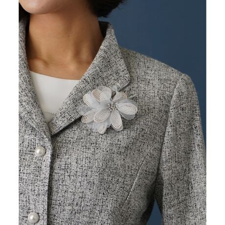 オーガンジー風素材とパール調モチーフの花弁を重ねたロマンティックなコサージュ。一点投入で華やかさが増すので、特別な日のスタイルに重宝するでしょう。ジャケットに付けたり、帽子に付けたりと幅広く活躍します。