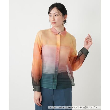 コーディネートをドラマティックにシフトさせるグラデーションカラーが美しいブラウス。透け感のある繊細なファブリック使いもデザインと好相性。同柄のボトムスと合わせた着こなしもオススメです。
