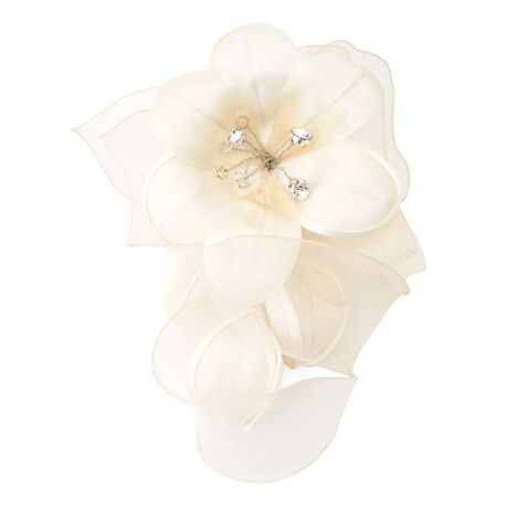 オーガンジー風の花弁を組み合わせ、立体感を持たせたコサージュ。中央には輝くパーツがきらめき、贅沢な雰囲気を演出します。ボリューム感のあるアイテムは周囲の視線を集めるでしょう。