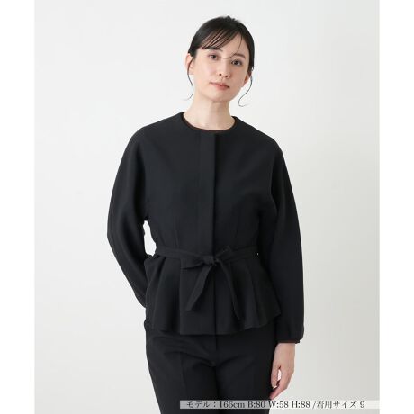 フロントの比翼仕立てがミニマルな印象を醸し出すノーカラージャケット。前ボタンはスナップを採用し、スマートな着脱を叶えました。初夏のスタイリングに馴染む軽やかな風合いながら、裏地を施した丁寧な作りが美しいシルエットをキープします。付属の共布ベルトを絞れば、裾に向かって広がるペプラム調のラインが際立ち、女性らしいメリハリのある着こなしを演出。洗練された大人の佇まいを完成させる一着です。