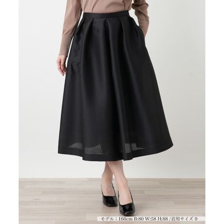 シルキーな光沢を湛えるポリエステル素材を採用したスカート。立体的なタックプリーツが織りなす美しいシルエットが、初夏のスタイリングにエレガントな気品を添えます。ウエストを適度にシェイプすることで腰周りをすっきりと見せつつ、裾に向かって広がる優雅なフォルムを構築しました。裏地付きで透けを気にせず穿ける安心感に加え、後ろホック&ファスナー仕様で着脱もスムーズに行える一枚です。