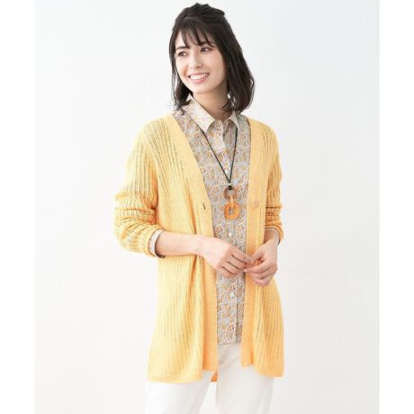 発色が美しいイタリア製の糸で編み立てたカーディガンです。