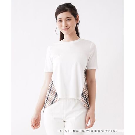 【EZUMi】のアイコンでもあるチェック×無地の異素材コンビネーションプルオーバー。絶妙な長さの半袖で二の腕をすっきりとカバー。前裾をインした着こなしでも楽しめます。後ろを少し長くカーブしたヘムで、スカートにもパンツにも合わせられる便利アイテムです。