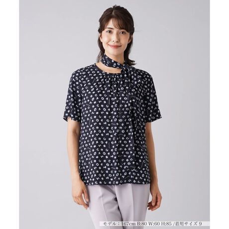 ブランドのイニシャルロゴを散りばめた、軽やかなシルエットのブラウス。共布のリボンベルトが付いているから、ウエストベルトとしてはもちろん、ボウタイとして使ったり、スカーフのように巻いたりと、自由自在にスタイルチェンジが楽しめます。