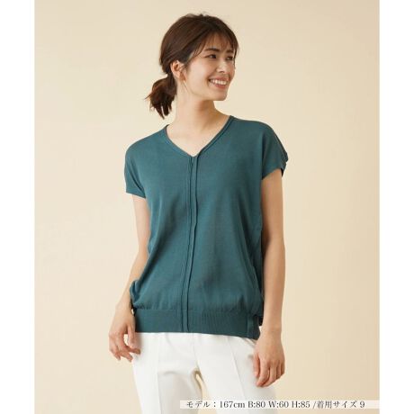 コットンベースのシアーニットでデザインした、清涼感溢れるVネックプルオーバー。ワイドに開いたネックラインがデコルテを覗かせ、絶妙な抜け感を作り出しています。肩をちょこんと覆うようなスリーブ、フロントやバックの切り替えなど、シンプルで終わらないさりげないディテールがこだわりを感じさせます。すっきりとしたボトムスでまとめると好バランスのコーディネートに。