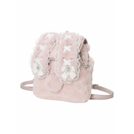 [型番:25590054205]レースアップのうさ耳モチーフがキュートなリュックサック。もこもこのファー素材で仕立てられており、スタイリングにシーズンムードをプラスします。小物類の整理に便利な内ポケット付きがポイント。コーディネートのアクセント使いに大活躍するアイテムです。