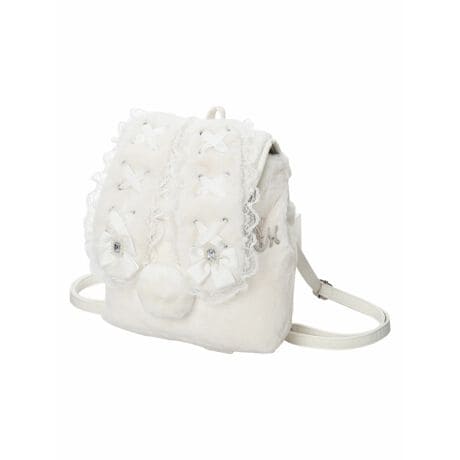 [型番:25590054205]レースアップのうさ耳モチーフがキュートなリュックサック。もこもこのファー素材で仕立てられており、スタイリングにシーズンムードをプラスします。小物類の整理に便利な内ポケット付きがポイント。コーディネートのアクセント使いに大活躍するアイテムです。