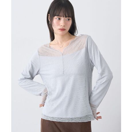 繊細なレースをジョイントしたフェミニンな雰囲気がポイントです。デコルテラインのスカラップレースはVカットとスクエアの前後で異なる2WAY仕様。羽織りアイテムにもアクセントを加え、様々なレイヤードを楽しんでいただけるおすすめのアイテムです。