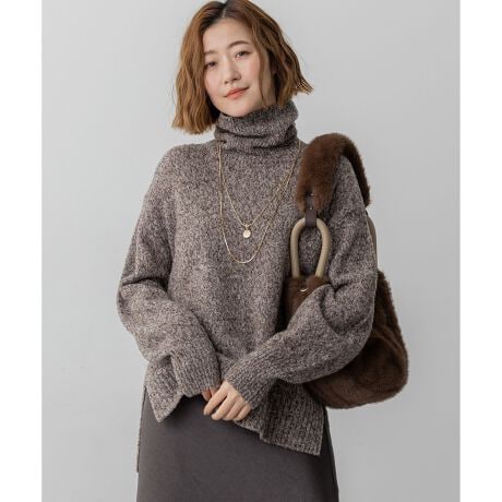 【洗える】ミックスブークレ サイドスリットタートルニット