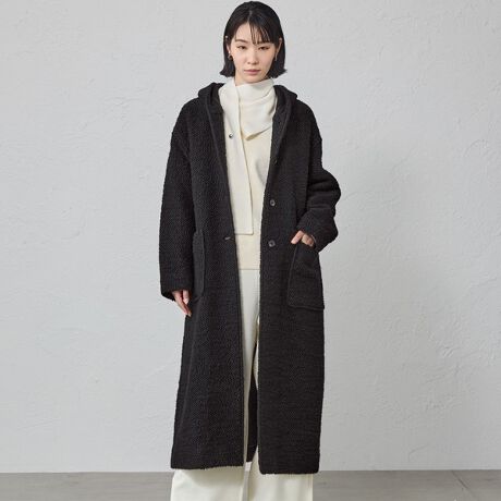 暖かみのあるウールロービング素材を使用した、フード付きロングコート。