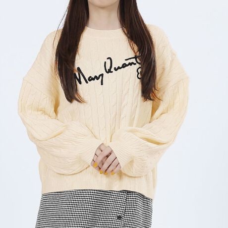 サインロゴのコード刺繍入りケーブルニット。◆ポイント・刺繍はチェーンステッチ・長袖◆コーディネート着まわしやすいサイズ感のケーブルニットでほど良く可愛らしさを演出。「ネイビー」はWEB限定カラーです。[型番:225-704804]