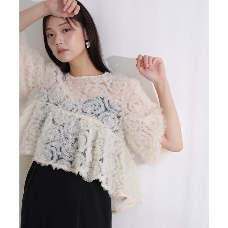 デコルテから袖にかけての透け感が、女性らしさを演出します。