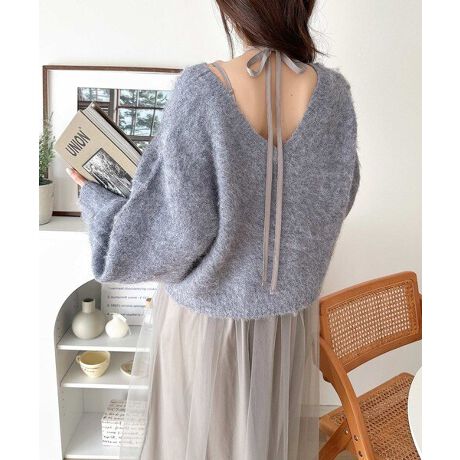 ・トップスは、ぽわん袖デザインの毛足のあるニット素材のプルオーバー