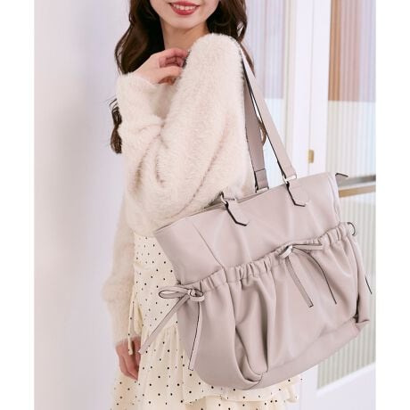 くしゅくしゅとしたギャザーと細めリボンがデザインポイントの大容量トートバック。