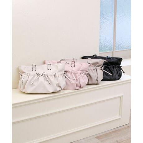 くしゅくしゅとしたギャザーと細めリボンがデザインポイントの大容量トートバック。
