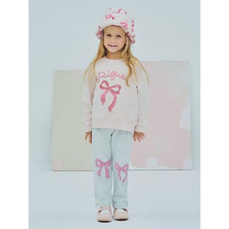 リボン、クルマ、ヒョウ。子どもたちがときめくモチーフをあしらった、ギフトにもおすすめしたいKIDSシリーズです。肌触りの良いリブ素材を使用した細身のストレートパンツ。ひざの部分に、3種類のモチーフをアップリケで表現しました。右後ろにポケットを付け、左腰にワンポイントのロゴ刺繍入り。色はリボンモチーフのグレー、ヒョウモチーフのベージュ、クルマモチーフのネイビーの3色展開です。同シリーズのワンポイントプルオーバーやフリースの羽織り、小物類を合わせたり、BABYサイズとのリンク・コーディネートもお楽しみいただけます。