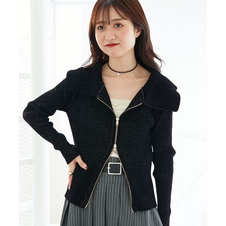 ふんわりとした肌ざわりのモール糸に、繊細なラメ糸を引きそろえたジップニット。