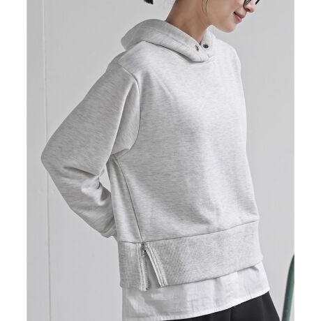 裾からシャツをちら見せしたようなレイヤードデザインがポイントのパーカー。