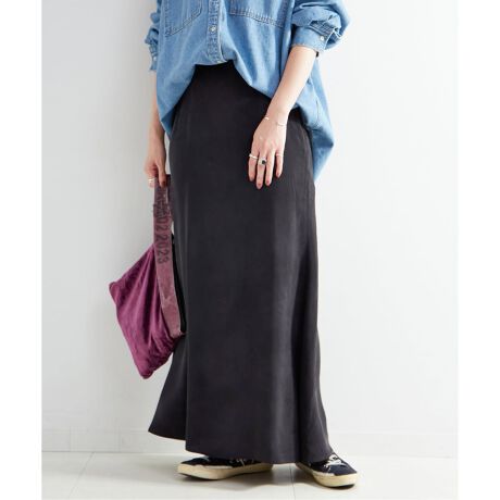 素材はシーズンレスで着用できる薄手のサテン生地で着回しが効き、一着持っていて間違いないアイテムです。ウエスト周りは程よいフィット感で、リラックスして穿いて頂けます。シルエットは緩やかなカーブから裾にかけて少し広がりがあるフレアで、歩くたびに女性らしい雰囲気が出るマーメイドシルエットになっています。