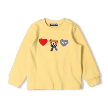 ハートのアップリケとクマの刺繍がポイント!リボンのモチーフ付き。少しレトロなデザインが可愛い!秋から春まで長く着られる裏毛素材のトレーナー、スウェット。【アイテム】トップス シンプル ガーリー フェミニン カジュアル お洒落 オシャレ かわいい 可愛い 普段着 デイリーウェア お出かけ着 お外着 お外遊び着 子ども こども 女児 女の子 ガールズ キッズ ベビーサイズ トドラーサイズ 幼稚園 保育園 小学校 通園 通学 小学生 2025年秋冬物新作 丸高衣料 ロングスリーブ 長袖 クリーム イエロー 黄色 ピンク ムージョンジョン