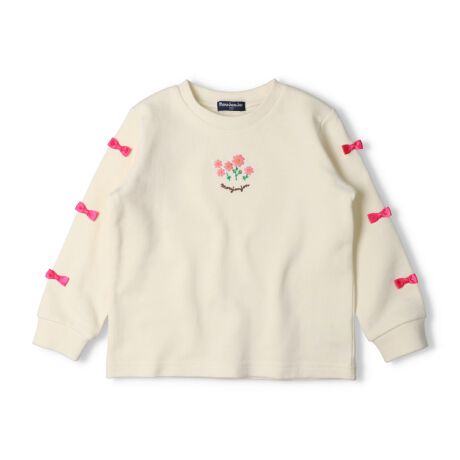 お花の刺繍入り。袖にはリボンのモチーフ付き。綿100%の裏毛素材のトレーナー、スウェット。秋から春まで長く着られる裏毛素材。【アイテム】トップス シンプル ガーリー フェミニン カジュアル お洒落 オシャレ かわいい 可愛い 普段着 デイリーウェア お出かけ着 お外着 お外遊び着 子ども こども 女児 女の子 ガールズ キッズ ベビーサイズ トドラーサイズ 幼稚園 保育園 小学校 通園 通学 小学生 2025年秋冬物新作 丸高衣料 ロングスリーブ 長袖 オフホワイト 白色 ネイビー 紺色 ムージョンジョン フラワー りぼん コットン100% 綿100%