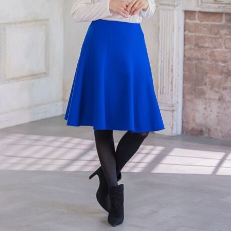 裾に向かって接ぎを入れることでウエストからヒップにかけてはすっきりとしたシルエットに、ヘムラインはフェミニンなフレアーシルエットに仕上げています。