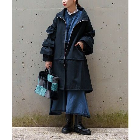 袖に螺旋状のフリルをあしらったボリュームスリーブが印象的なジップコート。