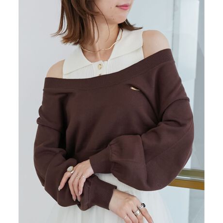ノースリーブの襟付きニットと、オフショルダーのニットがセットになった、トレンド感たっぷりのレイヤードアイテム。