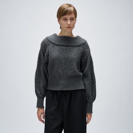 ・細やかな透かし編み柄が目を惹き、シンプルなスタイリングにも存在感をプラス。