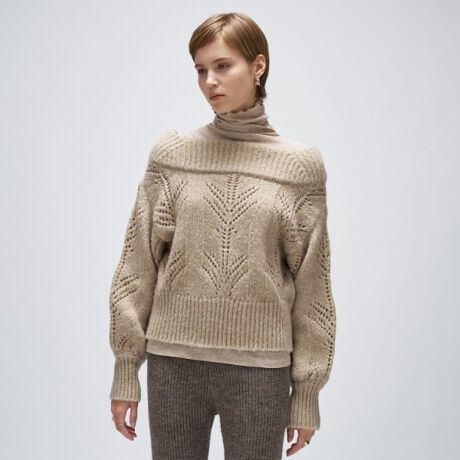 ・細やかな透かし編み柄が目を惹き、シンプルなスタイリングにも存在感をプラス。