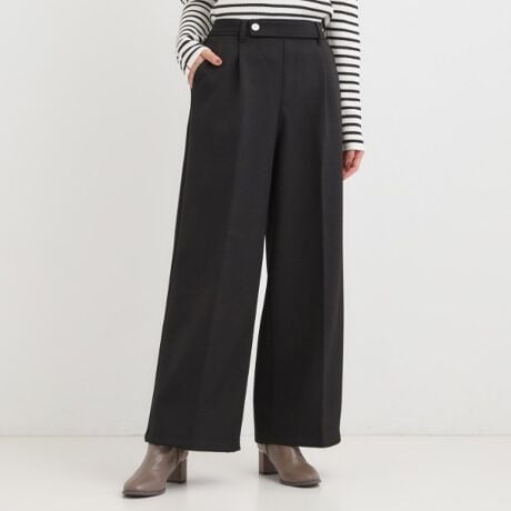 腰回りはすっきりとしたシルエットで、楽に穿ける暖かなワイドパンツ。