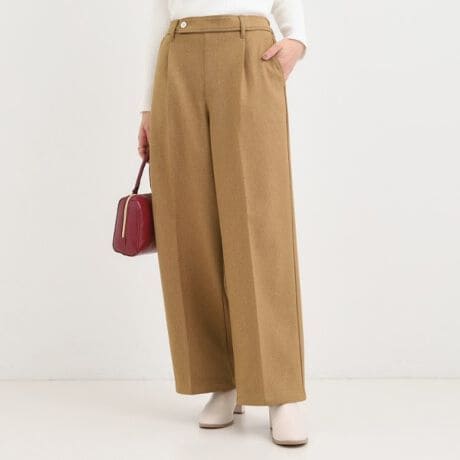 腰回りはすっきりとしたシルエットで、楽に穿ける暖かなワイドパンツ。