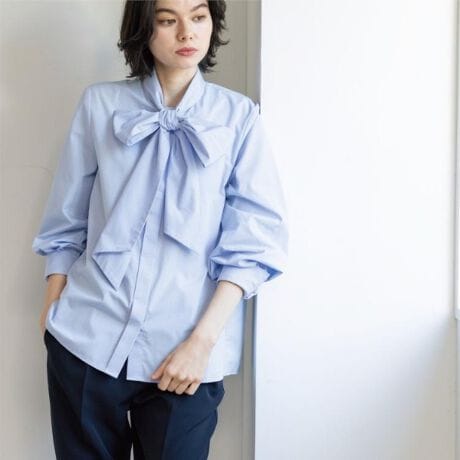 程よいハリのあるシャツ素材を使用した、上品なボウタイブラウス