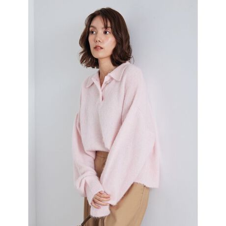 ふわっとした起毛感と、ほんのりシアー感がある糸で作った、ニュアンスのあるポロ衿ニットです。