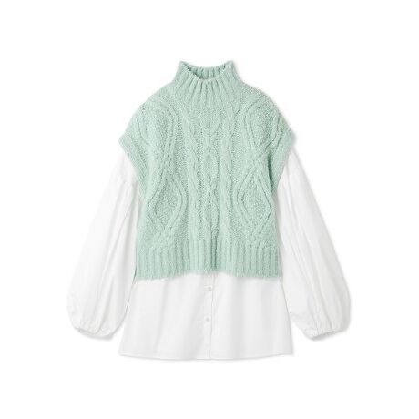 クロップド丈のケーブルベストと、重ね着しているようなブラウスの2枚セット。