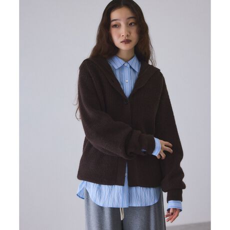 ざっくりとした片畦編みで編み立てたボタンタイプのニットフーディー。