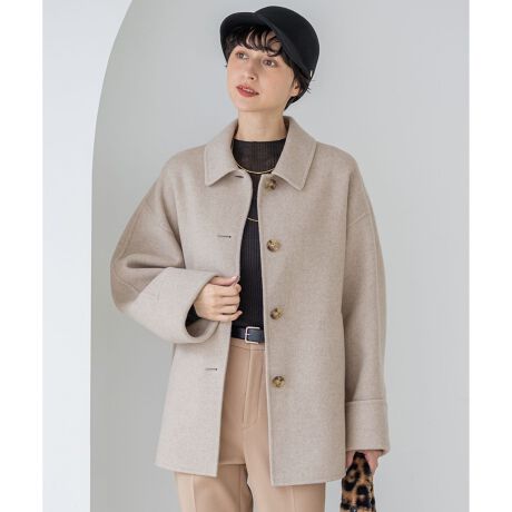 立体的な袖のフォルムが魅力的な、ステンカラーコート。首元のチンフラップを留めて襟を立たせることでエレガントな印象になりつつ、防寒にも◎。 ゆったりとした身幅と袖感なので、インナーに左右されず、着回しがききます。腰回りもしっかりカバーできるレングスなので、スカート・パンツどちらでもバランスを取りやすいデザインです。リバー仕立ての軽さと暖かさを併せ持った、NEWデザインアウターです。カラーは柔らかく軽やかなオートミール(#033)、着映え力抜群なティールグリーン(#064)、こなれた印象のミディアムグレー(#004)、王道主力カラーのブラック(#005)の4色展開です。