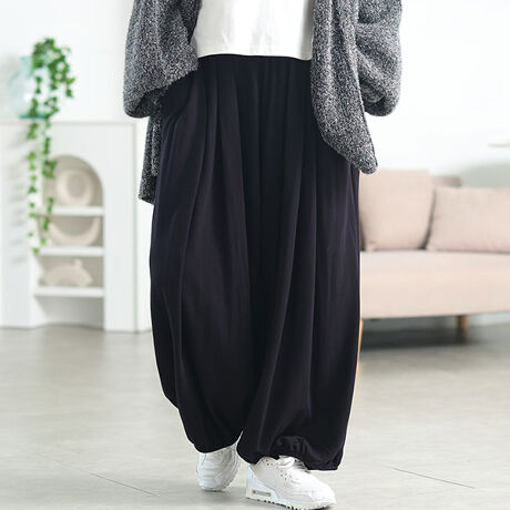 寒い季節も快適に、おしゃれを楽しめる裏起毛サーカスパンツ。肌に触れる裏面全体に、まるで毛布のようなふわふわの裏起毛素材を使用。ヒヤッとせず、暖かさに包み込まれるような心地よさは、一度穿いたら手放せません。バルーンシルエットがモード感を加速。裾にかけて丸みを帯びたバルーンシルエットが最大の魅力。気になる太ももやお尻周りをしっかりとカバーしつつ、こなれたカジュアル感を演出します。ウエストは総ゴム仕様で、リラックス感のある穿き心地。