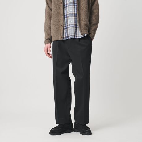 一般的なワイドパンツよりも控えめなテーパードを効かせ、厚みのある生地でももたつかず、すっきりとした印象に。