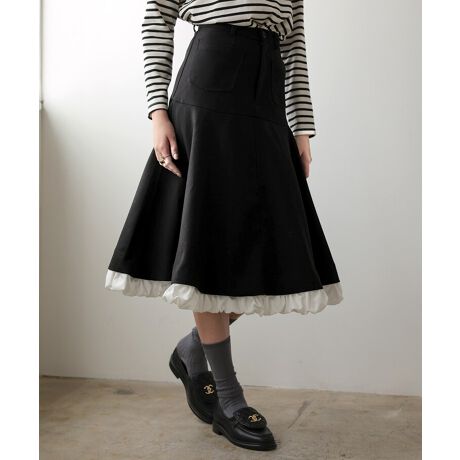 シンプルなブラックベースだから、カジュアルなニットと合わせる時は裾フリルを外して甘すぎず大人可愛いをアクセントに。