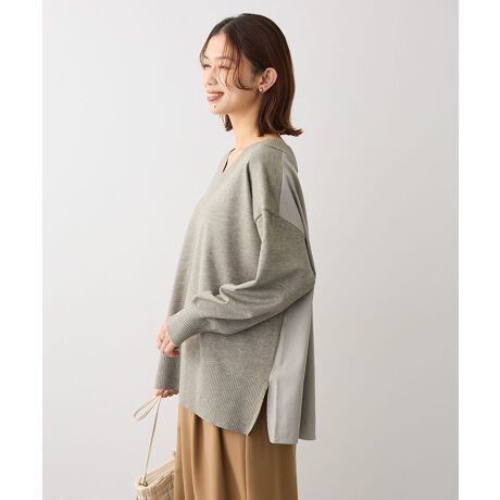 前身はシンプルなVネックに対し、後身には暖かみある布帛生地をジョイントした異素材ドッキングが楽しいデザインです。安心感のあるチュニック丈でシンプルなパンツと好相性。秋冬スタイルに馴染みやすいカラーで着回しやすいおすすめのアイテムです。