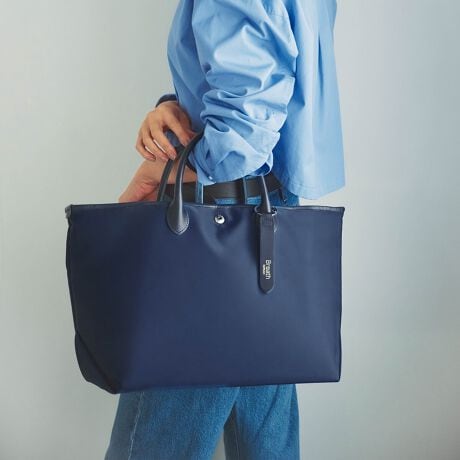 開閉はファスナーとホックの2WAY仕様、取り外し可能な底板付きで荷物の量に合わせてフォルム調整も自在です。