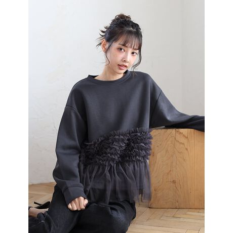 軽やかでハリのあるダンボール素材を使用することで、高見えする上品なシルエットをキープしつつ、楽ちんで快適な着心地を実現。裾にあしらわれたチュールドッキングデザインが、シンプルなプルオーバーに華やかさとトレンド感をプラス。カジュアルすぎずきれいめに着こなせるため、普段使いからお出かけまで着回し力抜群で、幅広いコーディネートに活躍します。