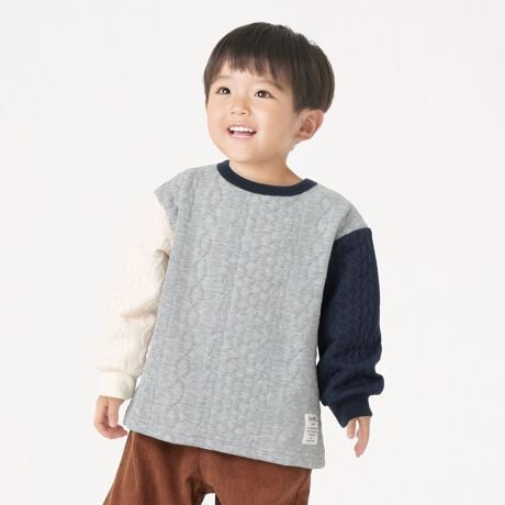 表面にはふくれジャカード素材を使用し、立体感のあるケーブル柄が秋冬らしい一枚です。