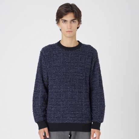 ツィードを思わせる表面感が魅力の、ツィードテイストニット。意匠糸を用いた表情豊かな編み地が、華やかで高級感のある印象を作り出しています。衿・袖口・裾にほんのりとラメ糸をあしらい、上品なきらめきをプラス。シンプルなデザインながら存在感のある編地でコーディネートの主役になる一着です。