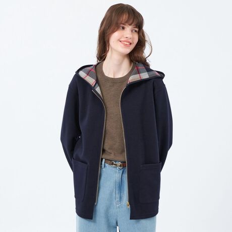 裏面のハウスチェック柄が華やかな、ジップアップコーディガンに、パーカーライクなミドル丈が登場。