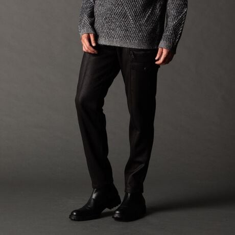 91その他2は、革の小シボを表現した柄の箔プリントを施して革パンの様なレザーライクな見え方に作っています。マルチなストレッチ性、ジャージ素材なのではのプリッとした横張り感もあり、シルエットを綺麗に作ります。